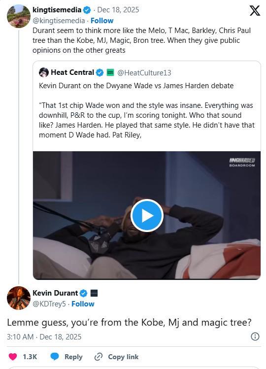 一位網(wǎng)友轉(zhuǎn)發(fā)了杜蘭特點(diǎn)評(píng)哈登和韋德的訪談片段,并聲稱杜蘭特與喬丹、科比、魔術(shù)師約翰遜和詹姆斯等傳奇球星沒有相同的思維方式,杜蘭特對(duì)此進(jìn)行了嘲諷式的回應(yīng):“讓我猜猜,你是來(lái)自科比、邁克爾-喬丹和魔術(shù)師約翰遜那個(gè)時(shí)代的人吧?”
